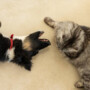 “You eat chicken? You eat chicken? Eat chicken,” he says, talking to the cat, before shouting “eat him, eat him,” to the dog.